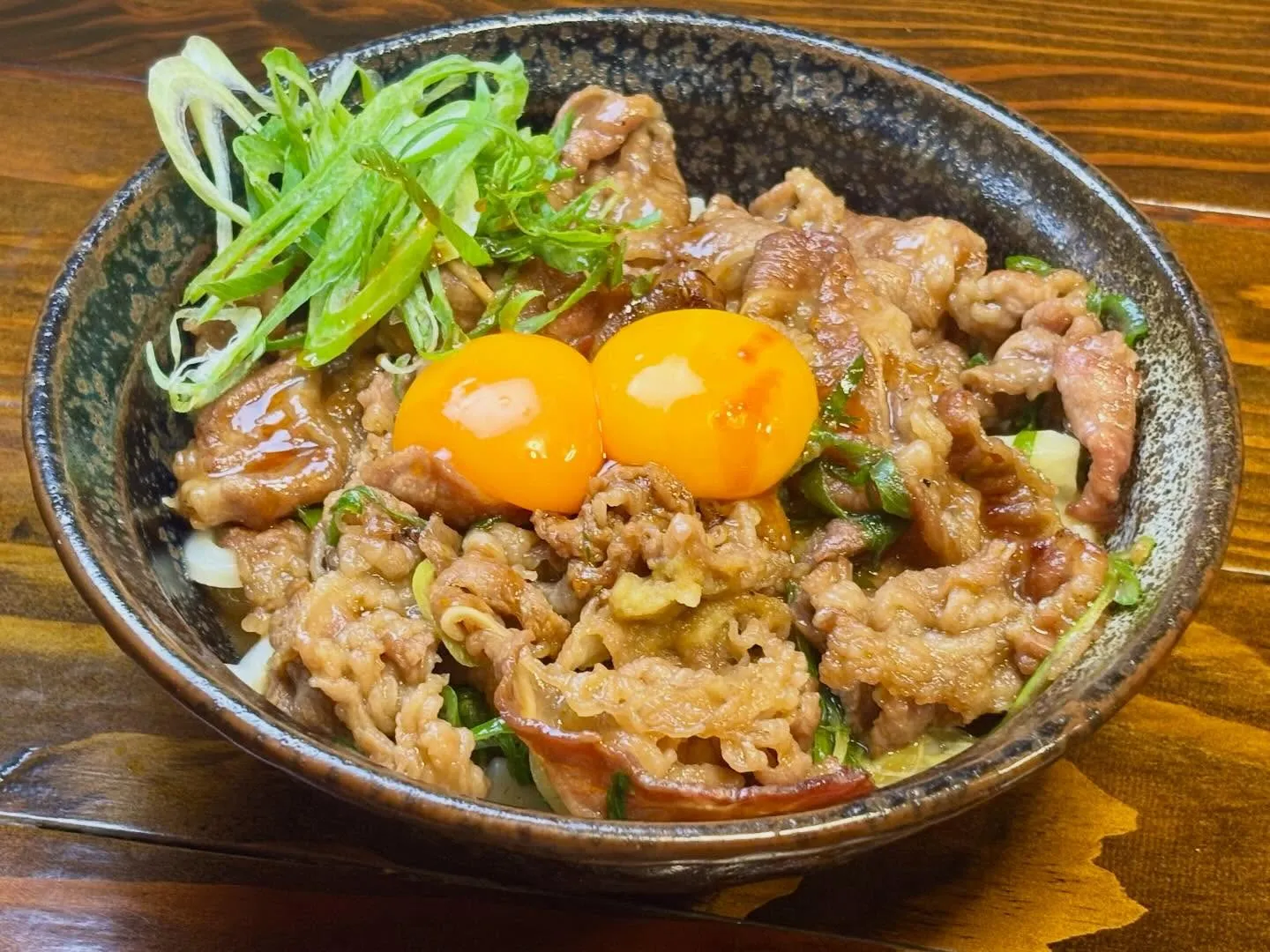 アツアツに焼き上げた牛すきを、茹でたての自家製うどんに豪快にのせ、さらに濃厚な卵黄をとろりと絡めて食べる至福の一杯です。